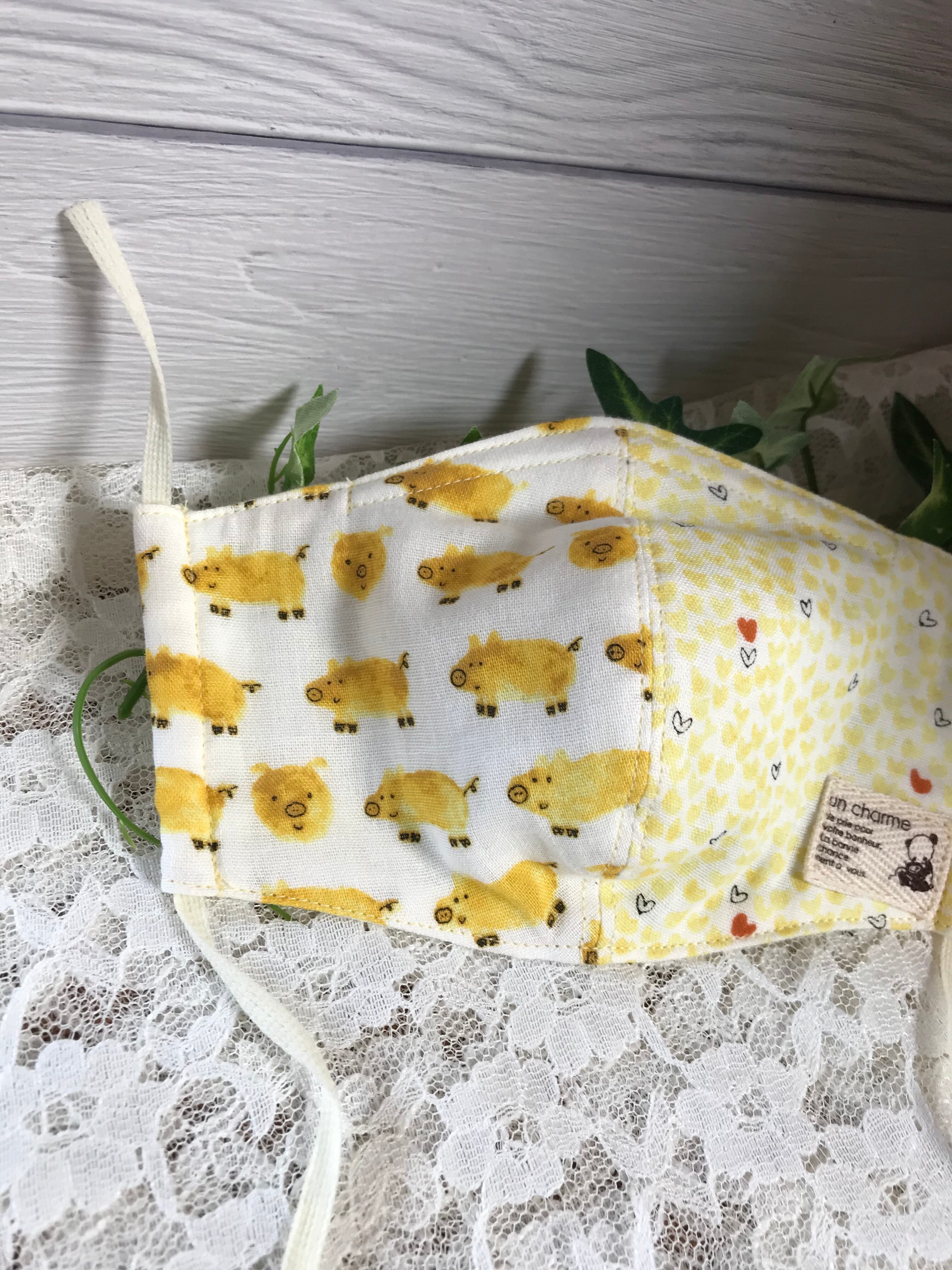 127.大人サイズ 立体マスク ノーズワイヤー入り パンダちゃんのタグ付き ブタさん&ハート柄