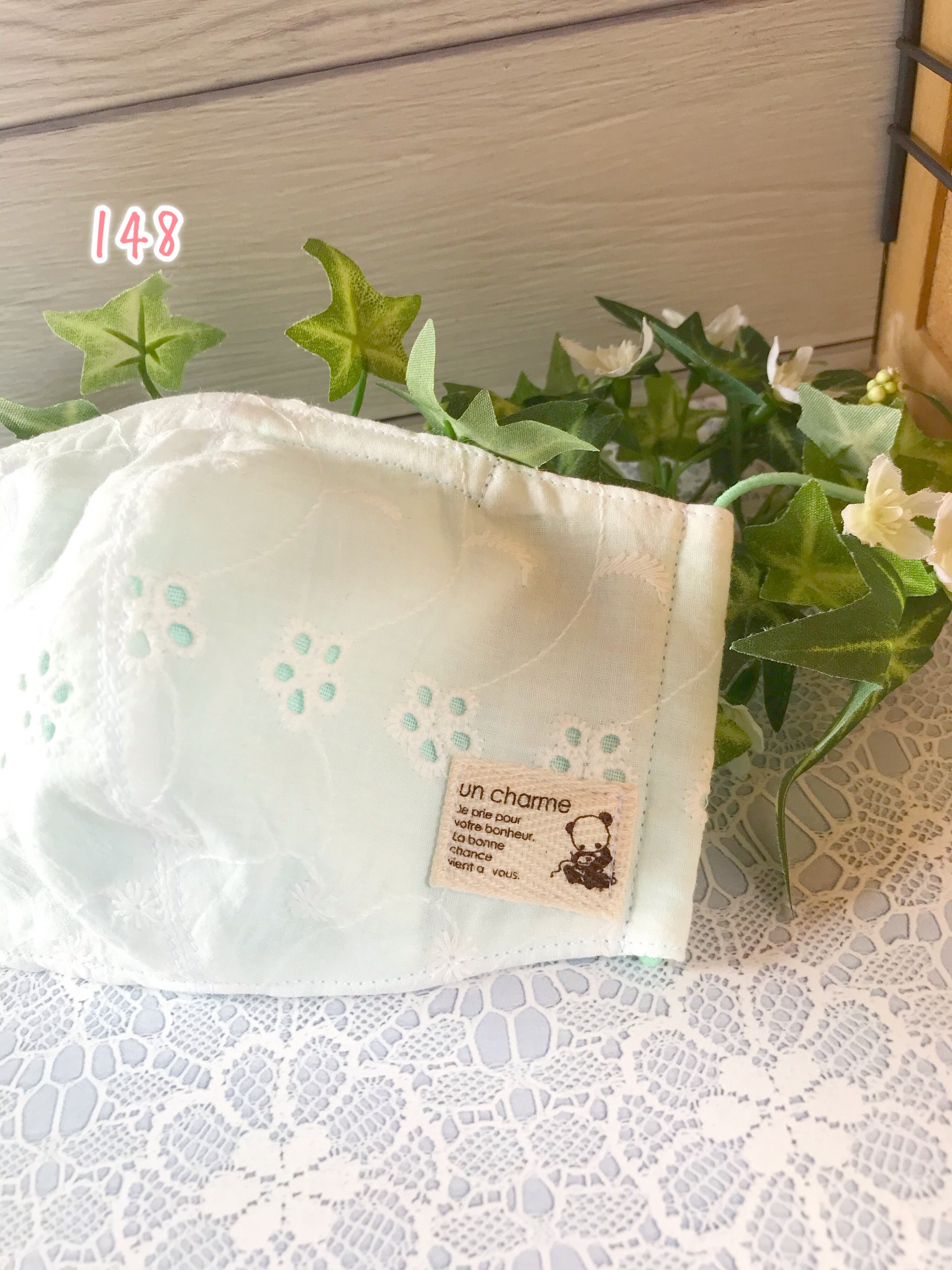 148、大人サイズ 立体マスク ワイヤー入り パンダちゃんのタグ付き コットンレース グリーン